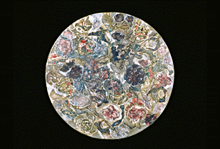 ![]() Nicole Brière L'envers du décor Collage, bâton à l'huile sur papier arches marouflé sur bois, diamètre 74 cm, 1998 |